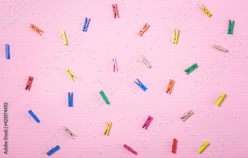 Multicolored little clothespins on a pink background. Education, school, business concept. clothespins, stationery