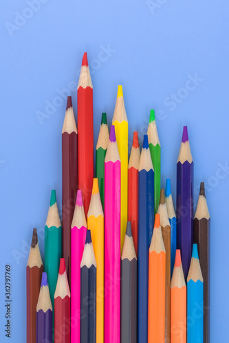 Multi-colored pencils laid out in random order. Template for stationery. Products for drawing and creativity.