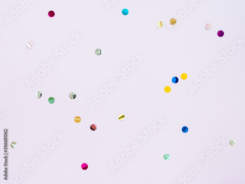 Multi-colored shiny round confetti on a pink background, top view, copy space, flat lay