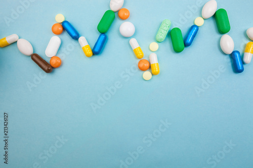 Multi-colored tablets and capsules in pulsation heartbeat white bottle for tablets, pharmaceutical medicine pills on blue background, an analgesic against diseases