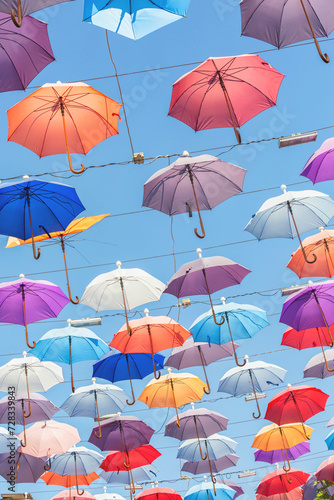 Multicolored umbrellas hanging above street in Antalya in sunny day and blue sky. Book cover. Turkey (Turkiye)