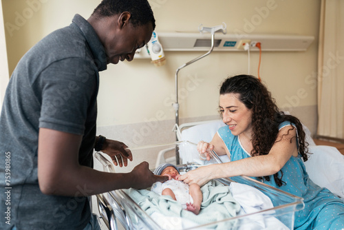 Multicultural couple in the hospital room after giving birth