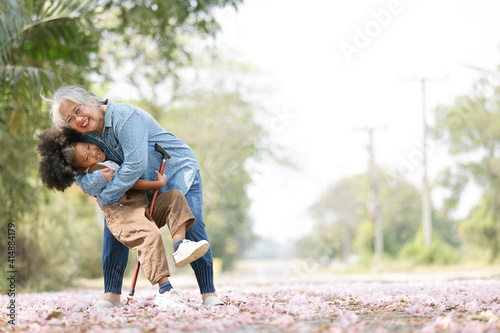 Multicultural family Afro grandchild with Asia grandmother playing in the park ,leisure activity togetherness concept.