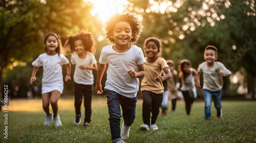 Multi-ethnic children playing together in a park, representing harmony