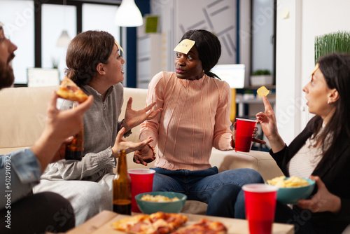 Multiethnic group of people play guessing game with sticky notes, laughing and having fun with drinks after hours. Office colleagues playing charades at party celebration with alcohol.