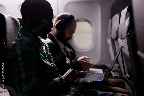 Multiethnic group of people travelling abroad by airplane, flying with international airline in economy class. Going on holiday vacation or business trip with plane tarnsportation service.