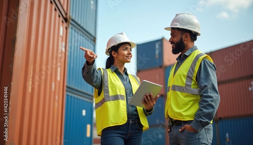 Multiethnic industrial engineers in hard hats, safety vests discuss logistics operations in container terminal. Black African American male supervisor with female colleague. Technology, tablet use at