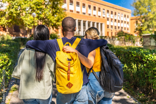 Multi-ethnic students embracing while walking together to the university