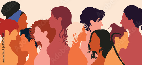 Multi-ethnic women and girls sharing ideas and information on a women's social network community. Vector flat cartoon illustration of a multi-cultural women and girl group.