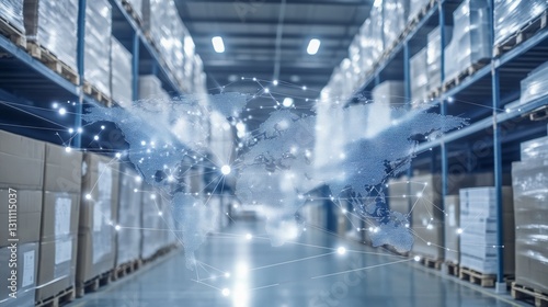 Multi-layered composition with sharp foreground showing detailed logistics network map, middle layer featuring translucent global connection lines, deep background revealing soft-focus warehouse