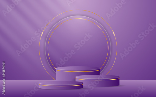 Multi-layered purple podium has a round shape and gold lines on the back for product presentation. cosmetic product display. vector illustration