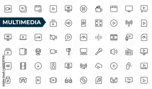 Multimedia line icon set. Cinema icon set. Movie sign collection. Set of cinema, movie, video icons, collection film, TV. Popcorn box package Big movie reel. Outline icon set collection.