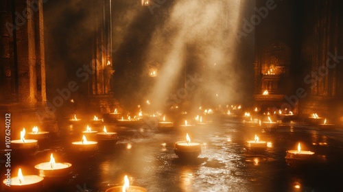 Multiple candles burning slowly, their soft glow illuminating the surrounding space on a dark, moody background