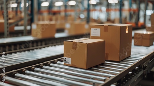 Multiple cardboard box packages seamlessly moving along a conveyor belt in a warehouse fulfillment center, a snapshot of e-commerce, delivery, automation, and products.
