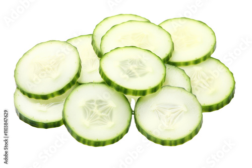 Multiple circular slices of fresh cucumber, displaying their juicy interior and crisp edges, arranged in an aesthetically pleasing manner