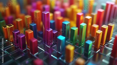 Multiple colorful D bars on a transparent glass platform, representing financial success and rising market trends in a futuristic setting.