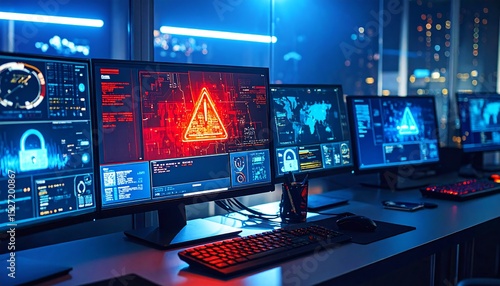 Multiple computer monitors displaying security alerts