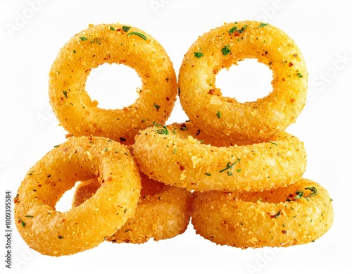 Multiple crispy onion rings or snack rings with a light golden-yellow color, speckled with finely ground herbs and seasoning isolated on white background