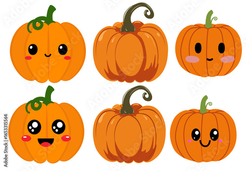 Multiple cute pumpkins in symmetrical layout, each with unique expressions, modern flat vector style