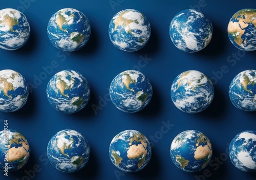 Multiple globe representations arranged on a deep blue background for global awareness