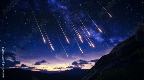 Multiple Perseid meteors streaking across a dark blue night sky, long exposure effect, soft glowing trails, detailed Milky Way, AI generated