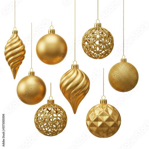 Multiple premium golden christmas tree ornaments suspended against a pristine transparent background with copy space, showcasing intricate designs, varying reflectivity, and meticulous craftsmanship,