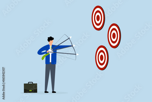 multiple purpose strategy, businessman aims several arrows at three targets.