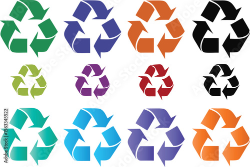 Multiple recycling symbols in various colors arrows green