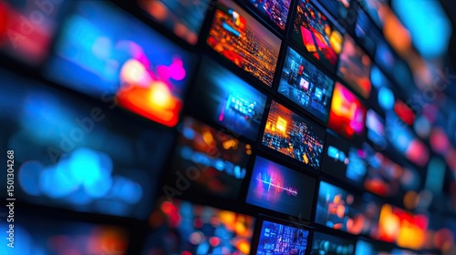 Multiple screens displaying vibrant cityscapes and abstract visuals in a dynamic arrangement