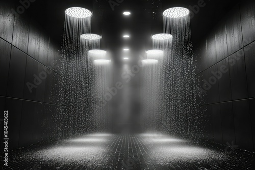 Multiple Showerheads Pouring Water in a Dark Room with Wet Floor