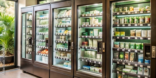 Multiple vending machines lined up, each offering a variety of food items for quick and easy access.