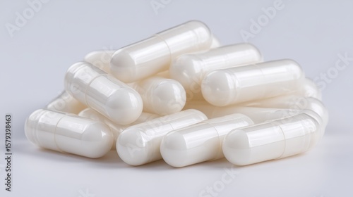 Multiple white capsules are arranged haphazardly on a smooth surface, suggesting dietary supplements or medication. The clean background emphasizes a focus on health and wellness