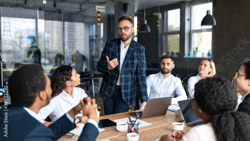 Multiracial Businessmen And Businesswomen Colleagues Having Corporate Meeting, Panorama