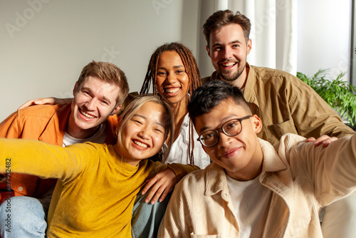 multiracial group of young friends smiling and taking selfies for the camera, asian, african american and european