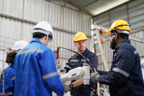 Multiracial industrial engineers working at automated AI robotic production factory, New industrial technology concept.