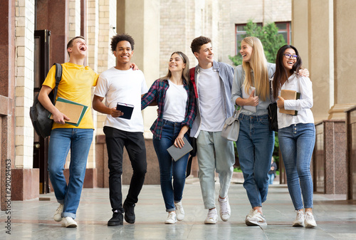 Multiracial students walking after classes in university campus