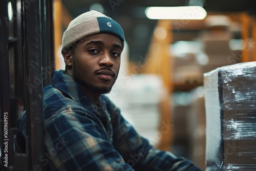 Multiracial warehouse worker operating a forklift, preparing products for shipment. This scene highlights logistics and supply chain management in a warehouse setting, Generative AI