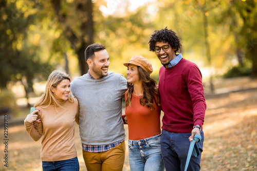 Multiracial young people walking in the autumn park