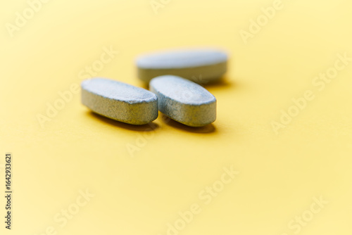 Multivitamin tablets on bright paper background. Close up. Copy space