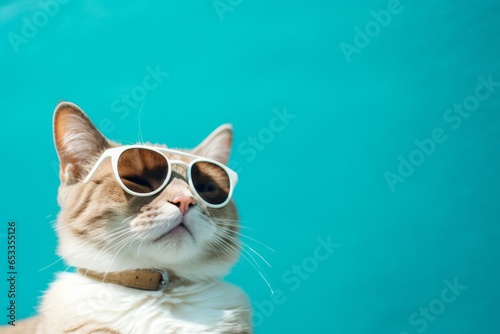munchkin cat wearing a trendy sunglasses against a tropical teal background