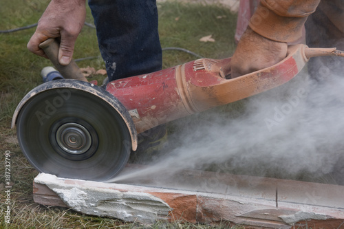 muratore taglierina tagliare mattoni lavoratore polvere tagliare mattoni
