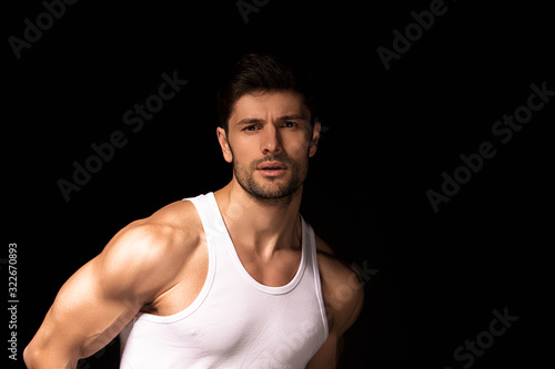 Muscle strong beautiful stripped male model with white shirt in denim gray jeans on black isolated font background