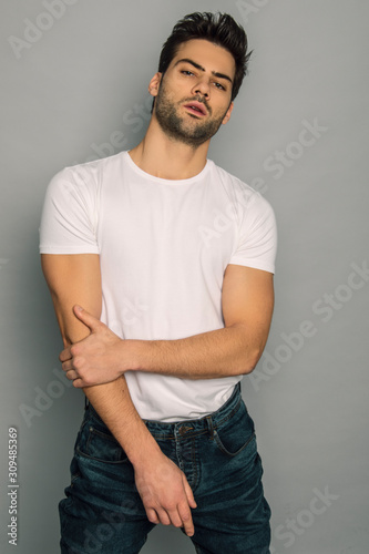 Muscle strong face beautiful stripped male model portrait in denim blue jeans white t-shirt on grey isolated font background with shadow