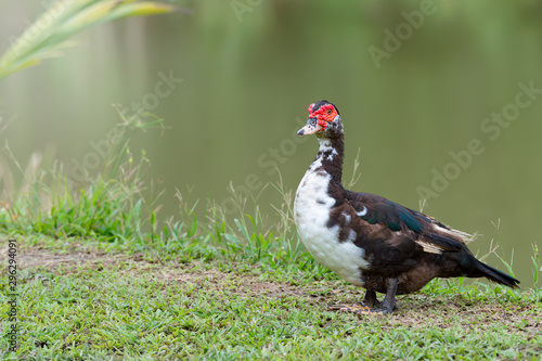 Muscovy duck in the field..Duck with red headed black and white plumage standing beside a big pond.