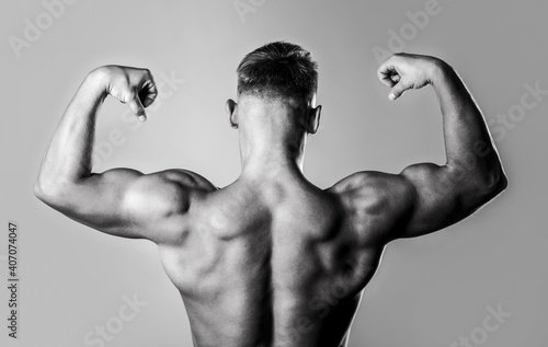 Muscular back, muscular man, muscled back, naked torso. Male naked, healthy musculars guy, torso man, isolated. Man with muscular arms, triceps. Waist, waistline.