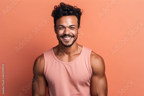 Muscular brunette guy smiling at the camera on a pink background. Generative AI.