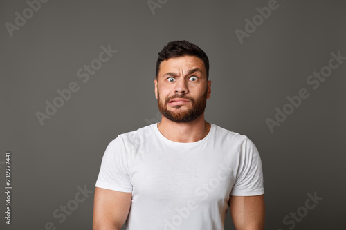 Muscular man grimacing guilty face at studio