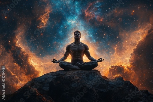 Muscular man meditating in lotus position on rocky surface with vivid cosmic nebula and starry sky background symbolizing inner peace and cosmic connection