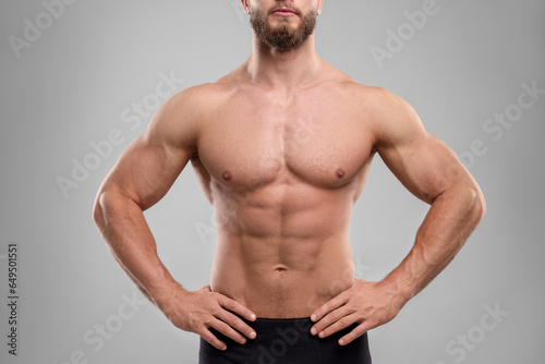 Muscular man showing abs on light grey background, closeup. Sexy body