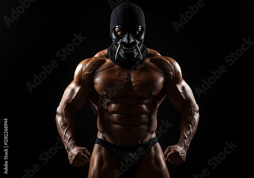 Muscular Man Wearing Mask on Black Background Showcasing Strength and Physique
